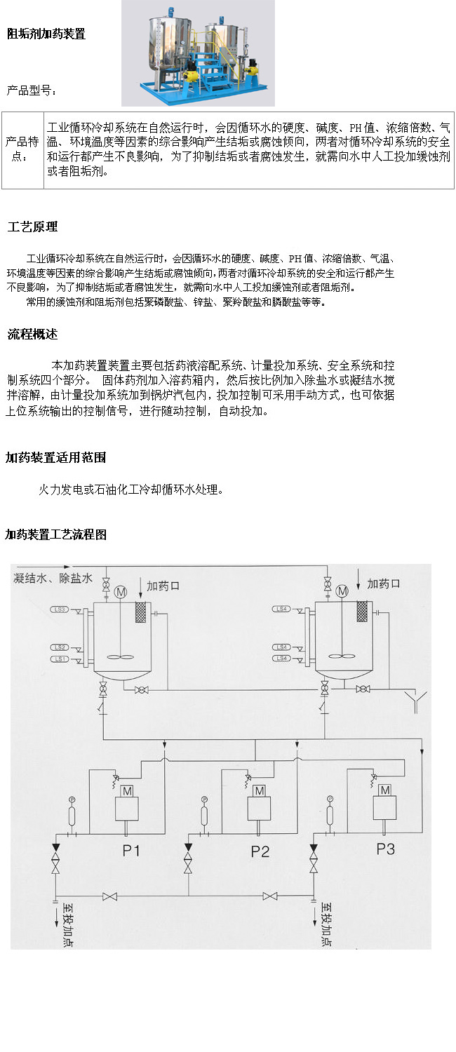 循環(huán)水加藥裝置以計量泵為主要投加設(shè)備、將溶藥箱、攪拌器、液位計、安全閥、止回閥、壓力表、過濾器、緩沖器、管路、閥門、底座、扶梯、自動監(jiān)視系統(tǒng)、電力控制系統(tǒng)等按工藝流程需要組裝在一個公共平臺上,形成一個組合式單元。配有攪拌系統(tǒng)、加藥系統(tǒng)和自動控制系統(tǒng),幾個固定式可組合成一個整體。